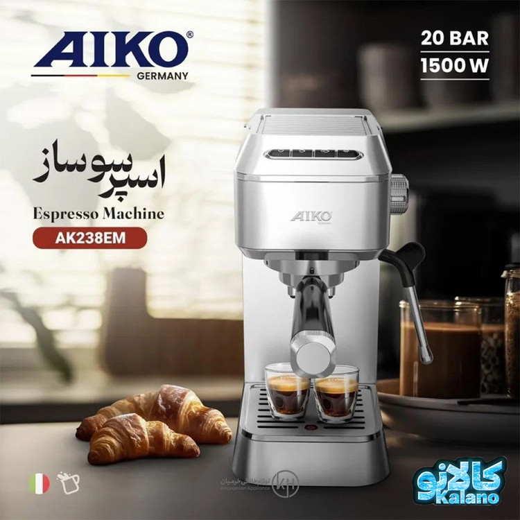 اسپرسو ساز ایکو AK238ES با قدرت موتور 1500 وات و فشار بخار 20 بار و با پمپ ایتالیایی خود قابلیت فوم گیری تا 75 درصد را دارد