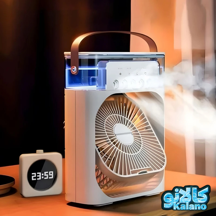 - خنککنندگی دوگانه: این دستگاه نه تنها با پرتاب باد خنک شما را سرحال میکند، بلکه با مکانیزم مه پاش، رطوبت ملایمی را در فضا پخش کرده که به کاهش دمای محیط و ایجاد حس تازگی بیشتر کمک شایانی میکند. این ویژگی برای روزهای خشک و گرم تابستان فوقالعاده کاربردی است.