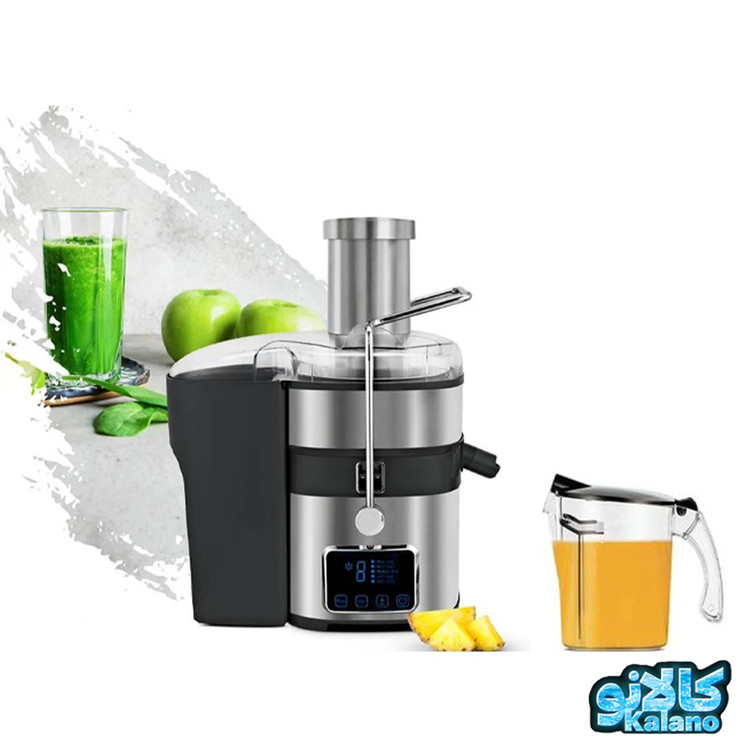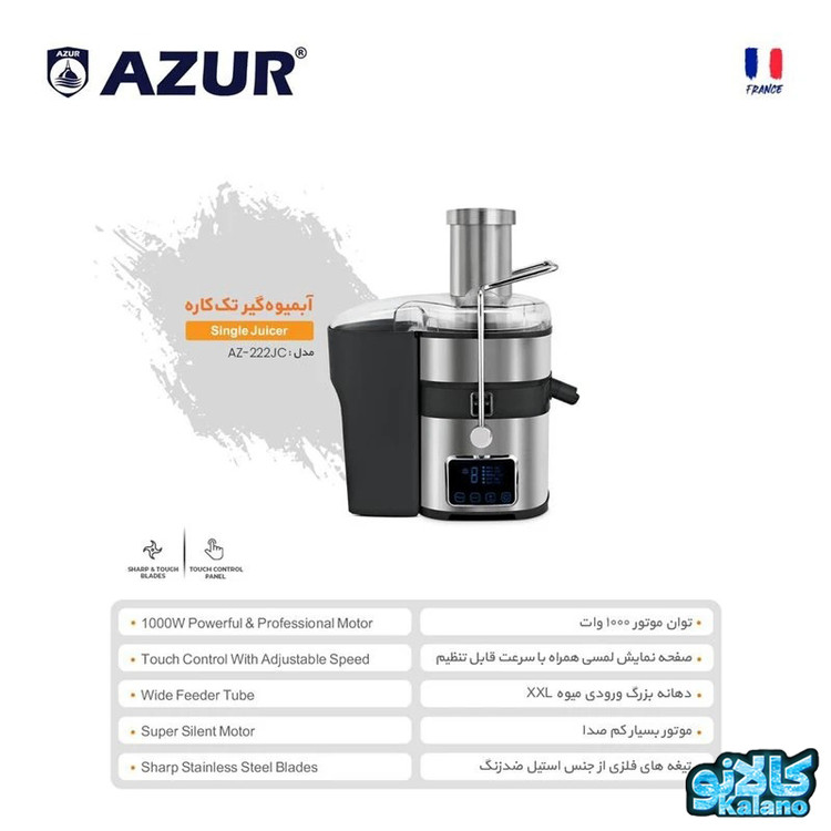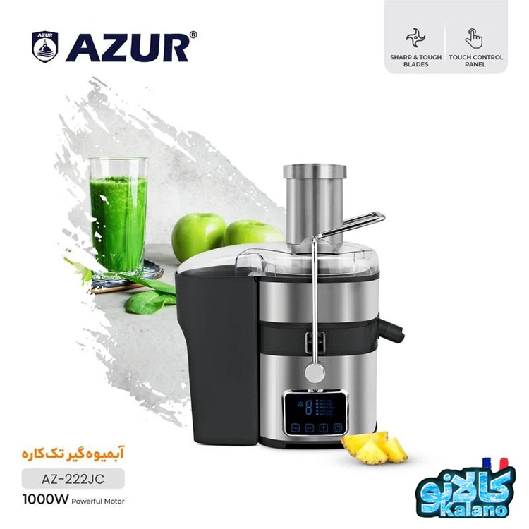 آبمیوه گیری ازور مدل AZ-222JC با توان 1000 وات دارای پنل تنظیم لمسی 5 سرعته و ورودی میوه کاملا استیل و حالت ضد چکه این ابمیوه گیری ازور مجهز به تیغه فلزی از جنس تیتانیم است